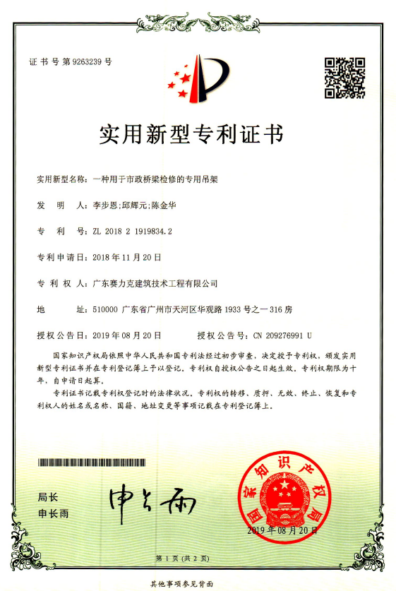 瀏覽量:1865 發(fā)布時間:2019.12.07由廣東賽力克建筑技術(shù)工程有限公司研發(fā)團(tuán)隊(duì)研發(fā)的“一種用于市政橋梁檢修的專用吊架”于2019年8月20日獲中華人民共和國國家知識產(chǎn)權(quán)局授予實(shí)用新型專利證書。專利號:ZL 2018 2 1919834.2。